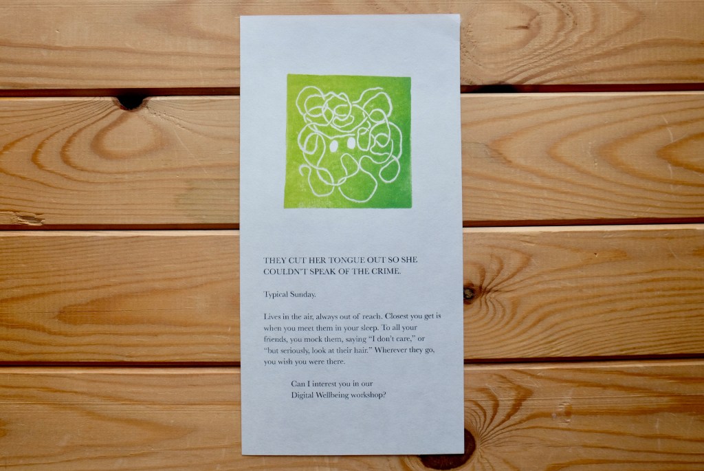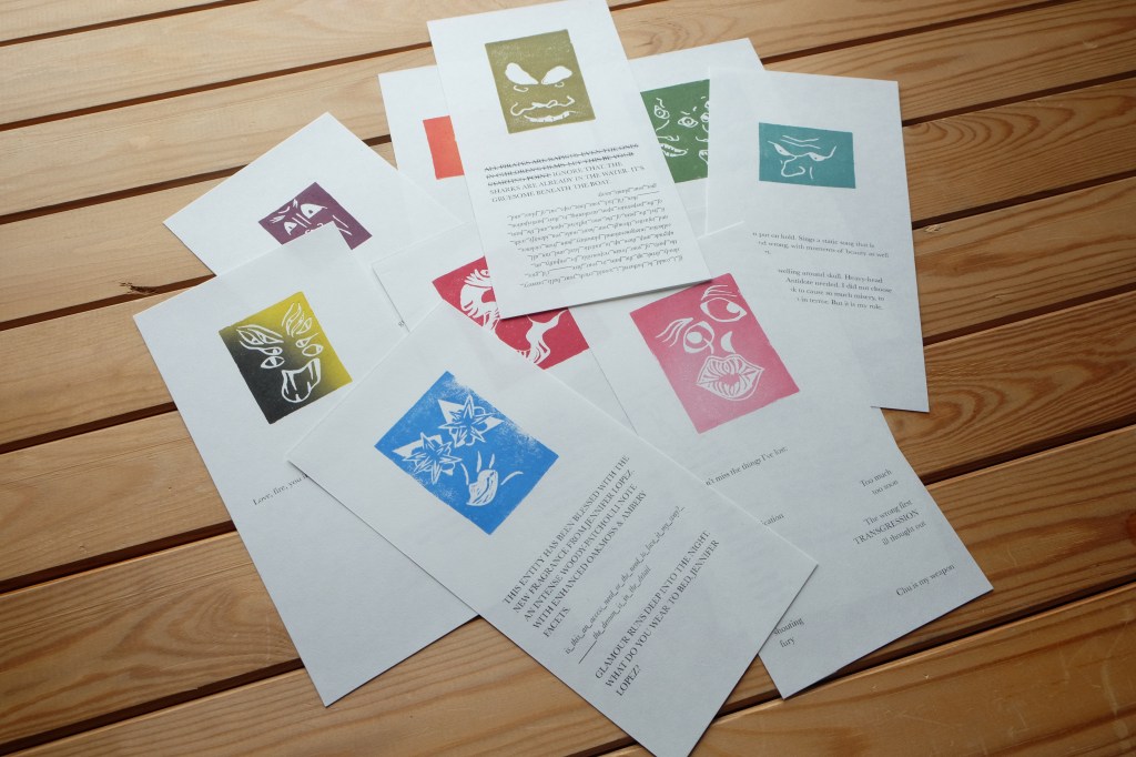 In 2022, these demons started to travel around the world, collecting writing produced by twenty friends of ours – artists, poets and performers. Each writer responded to the demons by scrawling on the backs of each print; below or in between or over the each other’s texts, complimenting and undercutting one another’s efforts.